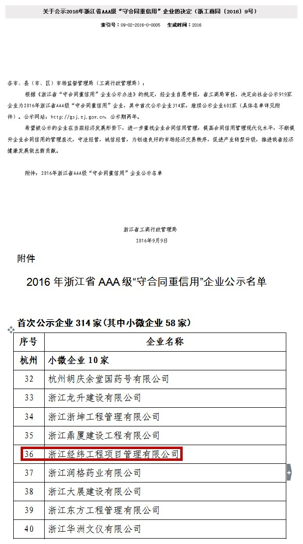 關(guān)于公示2016年浙江省AAA級“守合同重信用”企業(yè)的決定(浙工商同〔2016〕9號)